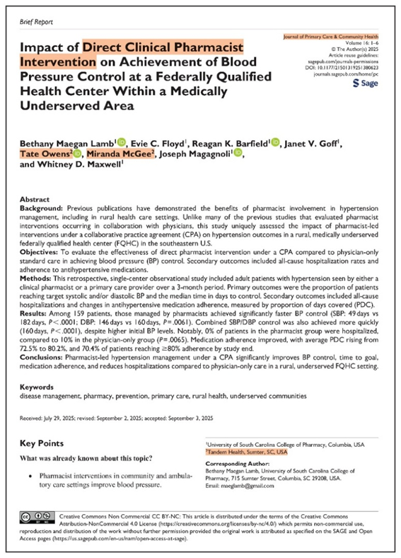Logan “Tate” Owens, PharmD, Clinical Pharmacist at Tandem Health, was recently published in the September 2025 issue of the Journal of Primary Care and Community Health. The article, titled ‘Impact of Direct Clinical Pharmacist Intervention on Achievement of Blood Pressure Control at a Federally Qualified Health Center Within a Medically Underserved Area’ shows that direct clinical pharmacist involvement significantly improves blood pressure control, medication adherence, and reduces hospitalizations at a rural Federally Qualified Health Center (FQHC). Patients managed by pharmacists reached target blood pressure faster, had better adherence to medication, and experienced no hospitalizations — highlighting the impact of pharmacist-led care in underserved communities.